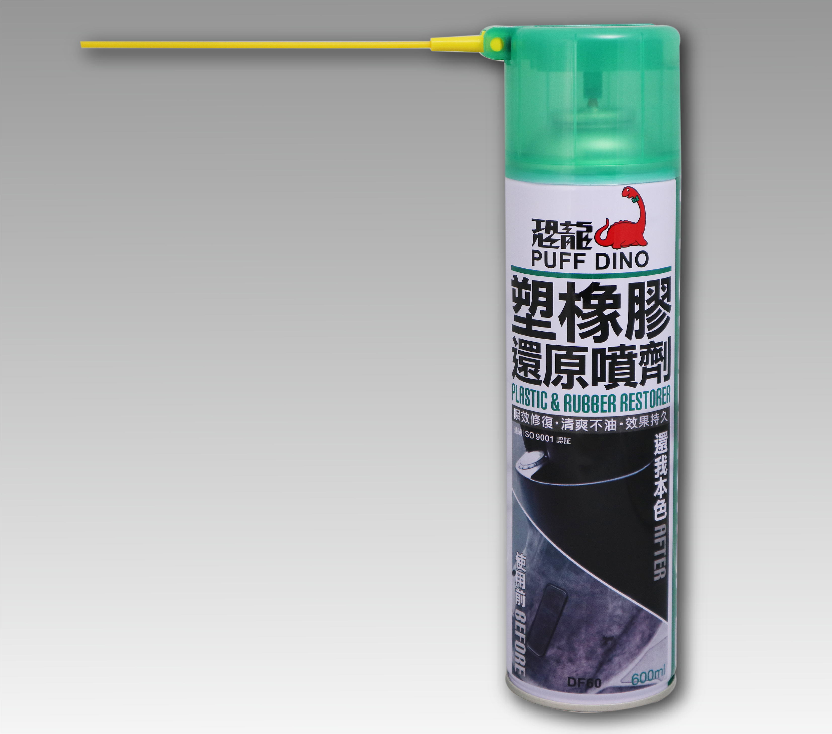 恐龍塑橡膠還原噴劑,立即修復車輛老化的塑膠及橡膠部件,還原其亮麗的光澤。並形成具有撥水、抗污的保護膜。施工簡易方便,膜層清爽不油膩,不會弄髒衣物及沾附塵土。用於橡膠部件可預防老化,抗UV,保持橡膠表面的彈性與光澤。