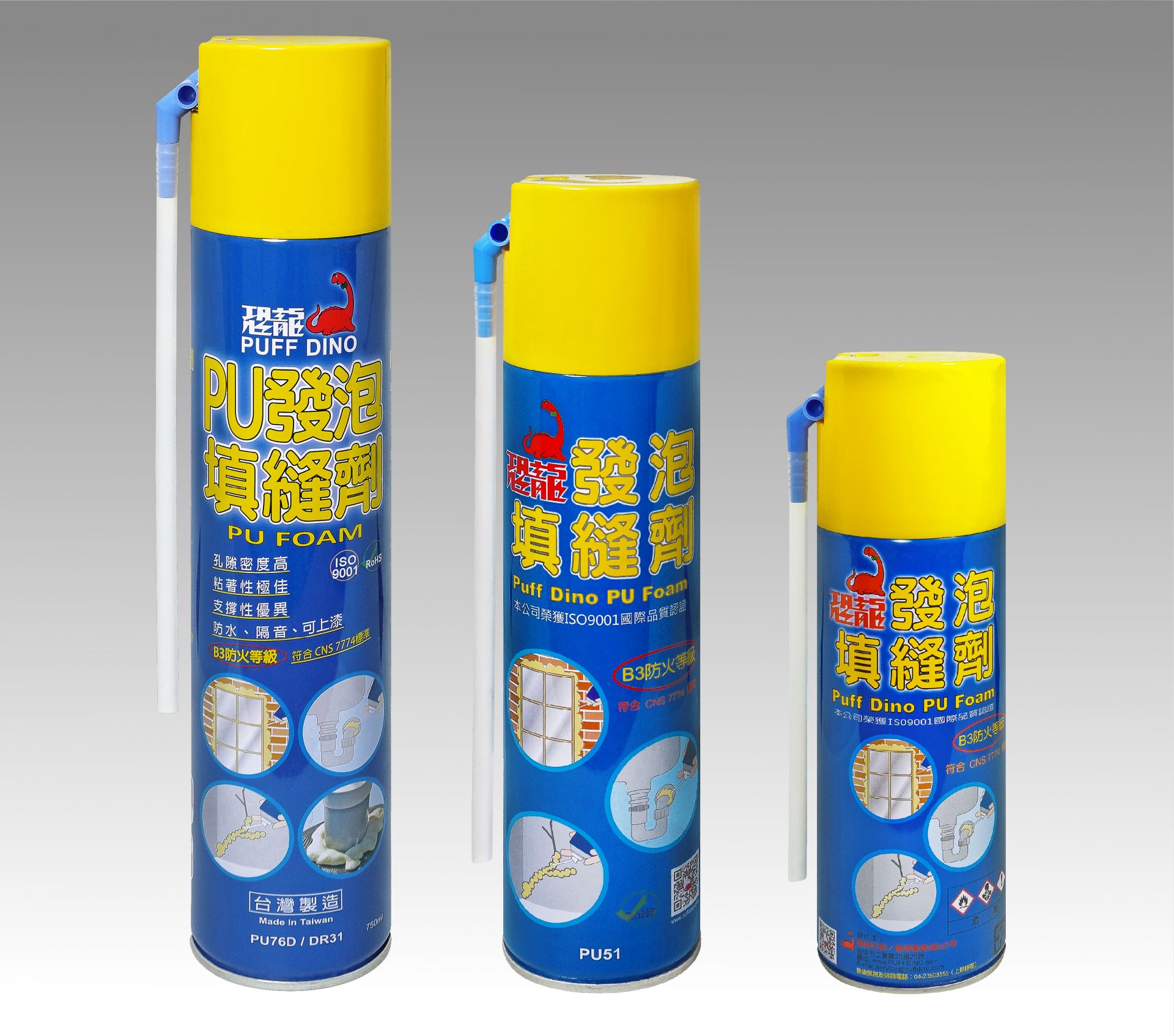 - 恐龍PU發泡填縫劑 (專業型)- 使用簡便,硬化後形成半軟硬之泡沫,具有保溫、隔音、防震、絕緣、防滲水等功能。可十分牢固附著於乾淨且不油膩的混泥土、灰泥磚塊、石綿、木材及各種人造材料表面上,如聚苯乙烯、PU硬化泡沫等表面上。